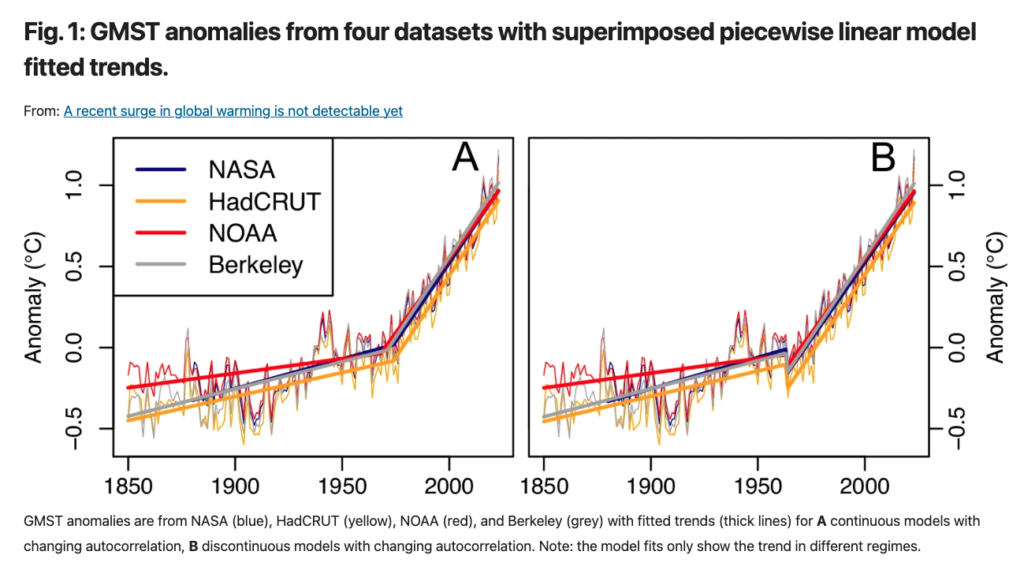 좋은 제목이 그렇듯, 이 제목은 논문전체 핵심을 잘 드러내고 있다. 지구표면온도에 대한 독립적인 4세트의 데이터를 분석한 결과, ‘지구온난화의 급가속surge은 아직 감지할 수 없다’는 것이 논문의 핵심이다. 헌데 기후변화 부정론자들은 이를 ‘지구온난화는 없다’고 제멋대로 해석한뒤 동료 부정론자들과 공유하고 있다 :