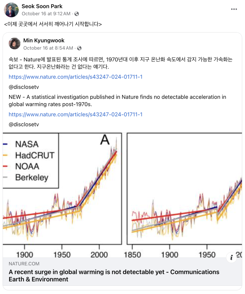 민경욱의 포스팅을 공유한 박석순은 한국의 대표 기후변화 부정론자이다3. 그리고 그는 위 온도데이터를 전면적으로 부정하는 사람이다. 그는 위 지구온도 그래프를 ‘세계기상기구 WMO의 통제하에 조작된 그래프들’이며 이를 발표한 과학기구들을 ‘돈과 권력에 굶주려 과학적 진실을 은폐하는 부패집단’이라 주장한다4 :