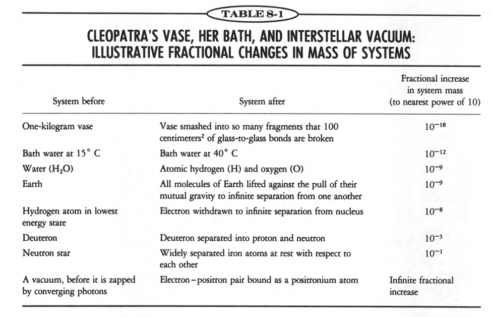 혹시 이런 개념이 생소하고 이해가지 않는다면, 파인만의 지도교수였던 휠러의 <Spacetime Physics>를 읽어 볼 것을 추천드린다. 이 책 8장에서 저자는 ‘질량-에너지 등가’ 개념을 상세히 풀어 설명하고 있는데, 특히나 물을 끓이는 정도의 일상적 에너지부터 핵융합 반응같은 높은 에너지를 수반하는 반응까지 고루 예를들며 반응 전/후의 질량증가 정도를 계산해놓은 표는 꽤나 흥미롭다 :