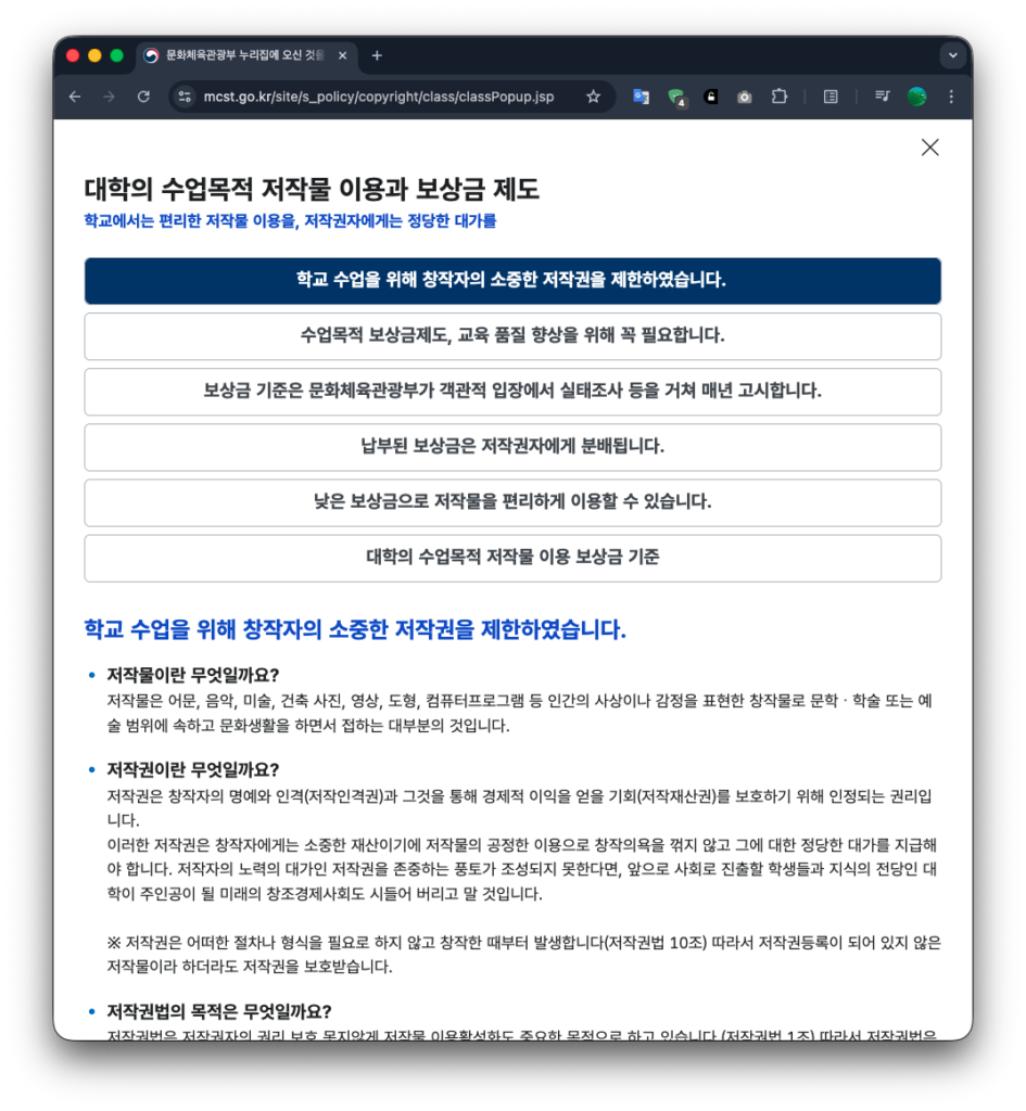 ‘수업목적 보상금 제도이하 수목보’라는게 있다. 대학강의에 사용되는 저작물에 대한 정당한 보상을 위해 만들어진 제도라고 한다1. 나는 몇년전 한국문학예술저작권협회 이하 문저협 로 부터 내 유튜브 영상들이 대학강의에서 사용된 댓가로 저작권을 지급하겠다는 연락을 받았는데, 그 계기로 수목보 제도를 처음 알게 되었다.
