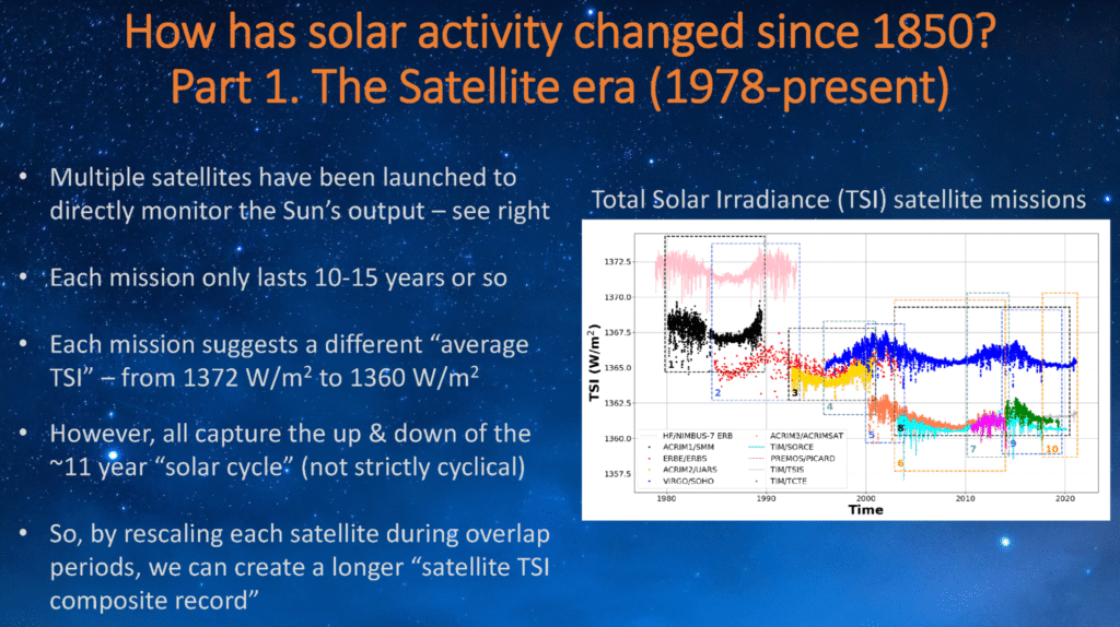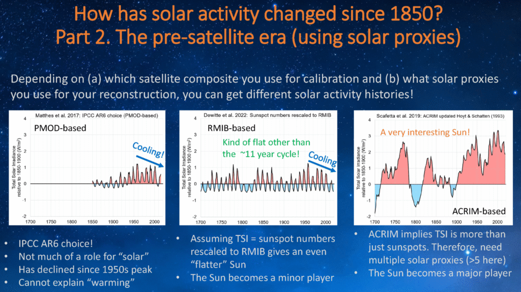 Soon은 slide #1과 #2에서 TSI 원본 데이터와 그에 대한 여러가지 합성방법을 보여주며, 마치 기후과학이 허술한 측정과 마구잡이식 연구에 기반하는것 같은 뉘앙스를 풍겼다. 그런데 이는, 확고히 다져진 과학적 기반 위에 의심의 씨앗을 뿌리는 행위다.