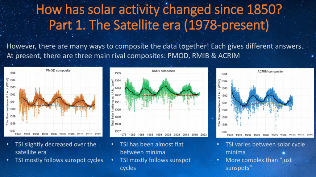 slide #3에서 Soon은 3가지 통합 TSI 각각을 기반으로 과거로 연장된 TSI를 보여주며 PMOD와 RMIB와는 반대로 최근 수십년동안 ACRIM은 뭔가 엄청난 폭으로 변하는것 처럼 말하고 있다. 하지만 이는 청자에 대한 기만이다. 그 어떤 composition도 그런 급격한 증감경항을 보이지 않는다. 모든 TSI 측정/통합 결과는 ACRIM gap 근방에서 최대 0.5W/m2 가량의 차이만 보일뿐, 그 모두는 대략 1361W/m2을 중심으로 ±1W/m2 범위 안에 있다 :