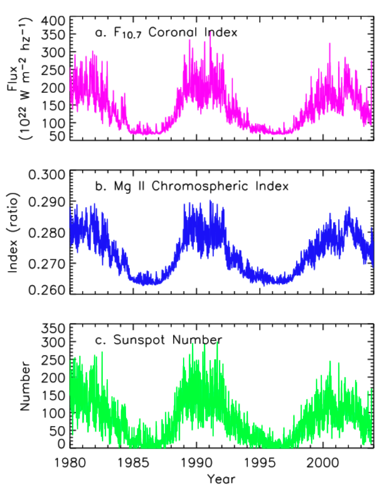 Fig #6. 태양활동을 추정 할 수 있는 직접 지표들 송명(2004, Fröhlich). F10.7은 태양표면에서 자유롭게 운동하는 전자의 활동성을 나타내고, Mg Ⅱ Index는 태양의 자기장 복사정도를 나타낸다. 이 두 지표 모두 89년 부터 91년까지의 ACRIM gap에서 증가경향을 보이지 않고, ACRIM 합성에서 보이는 86년 저점과 96년 저점 간의 차이도 없다.