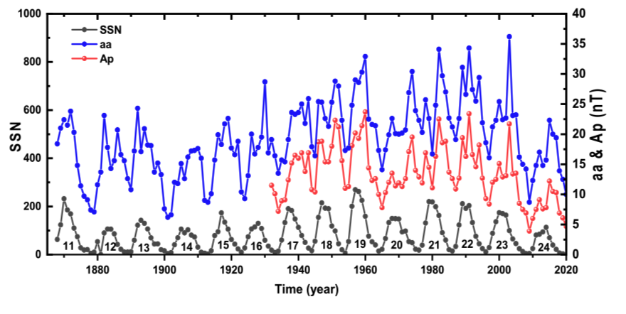 - Predicting the maximum sunspot number and the associated geomagnetic activity indices aa and Ap for solar cycle 25 (2021, Astrophysics and Space Science) [^]