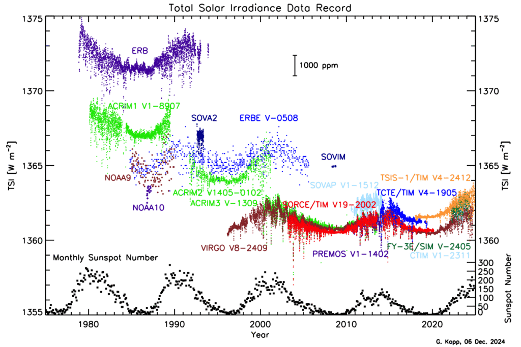 아마 외계인들이 지구에 존재하는 수많은 종류의 인간사회를 보며 가장 본받을만한 것들을 꼽는다면, 과학자 사회가 빠질 수 없을것이다. 태양을 연구하는 학자들은 ACRIM composition을 아무 이유없이 배제하지 않았다. 그들은 제기된 모든 종류의 통합방법을 논리와 이론, 그리고 여러 관측을 통해 검증했다. 그렇게 기후학자들은 어떤 결론을 정해놓고 연구하지 않는다. 그들은 CO2비료효과를 부정하지 않으며, 갑작스런 해저메탄 분출이 급격한 온난화를 촉발할것이라는 식으로 기후변화 tipping points에 대한 근거없는 과장을 만들어내지 않는다. 그들은 무작정 우기는 식이 아니라 근거와 논리에 입각하여 학자들의 소통방식인 논문을 통해 싸워왔고, 내가 하는일은 내가 가진 가장 날카로운 지적도구들로 그들을 검증하는것 – 그리고 그것들을 배우고 알리는 것이다.[^] - 그는 그 영상에서 ‘윌리순에게서 받았다’며 TSI 원본데이터를 아주 비밀스럽고 전문적인 통로로 입수한것처럼 말하는데, 그건 누구나 볼 수 있는 데이터다. Fig #3은 LASP의 연구자 Greg Kopp의 개인 홈페이지에서 가져온 TSI 데이터인데, 나는 이 글을 2024년 12월 중순에 쓰고있고 Fig #3은 2024년 12월 6일자까지 update된 최신 데이터이다. 박석순 입에서 나오는 거의 모든 말들은 그가 얼마나 무지하고 게으른지를 보여줄 뿐이다.[^]