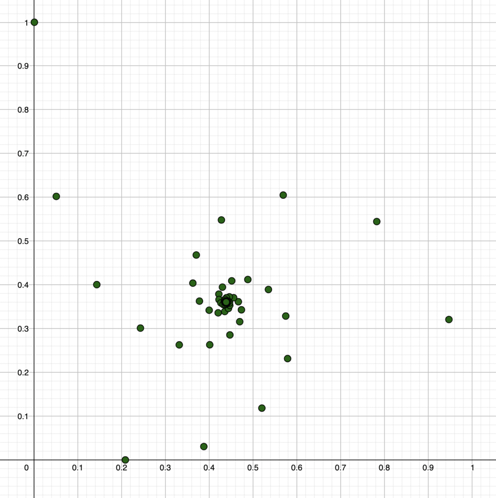앞서 언급한 영상의 하이라이트는, 수렴지점으로 나선을 무한히 확대하는 마지막 10초이다. 필자는 이 장면을 만드는 과정에서, ‘만약, 계속 확대하다가 어떤 다른 두 frame에서 \(^{n}i\)의 분포가 정확히 동일하다면, 그 두 지점을 시작과 끝으로 하고 무한루프를 돌리면 되지 않을까?’라는 생각을 했다. 하지만 실제로 확대하다보면, 그런 지점이 존재하지 않는것 같다는 사실을 직감하게 된다.